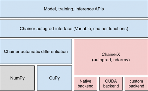 Figure:In addition to the multidimensional array implementation which corresponds to NumPy/CuPy, the Define-by-Run style automatic differentiation function is covered by ChainerX.