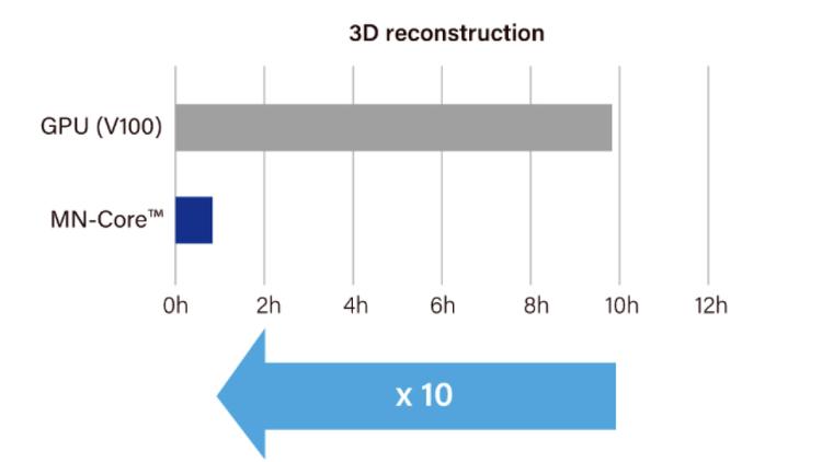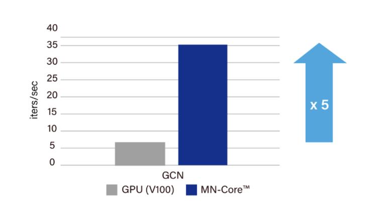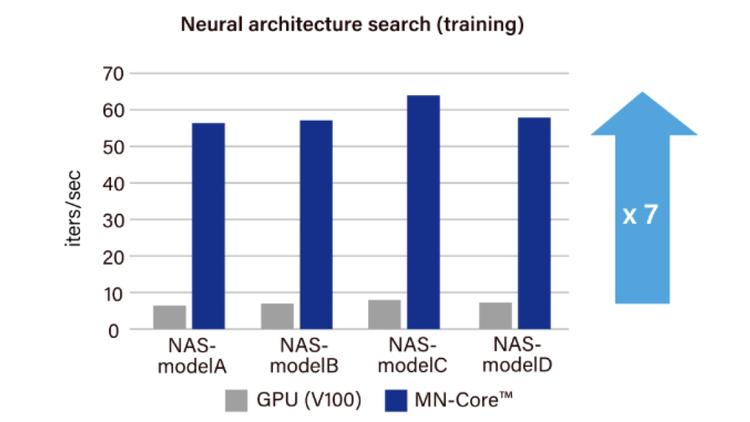 高い省電力性と高いピーク性能を両立するMN-Coreシリーズを用いることで、様々な実際のAIワークロードにおいてGPUに対しての高速化を実証しています。