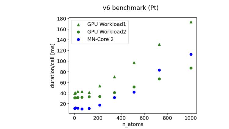 PFNのクラウドサービスPFCP™を通じたMN-Core 2(第2世代)の計算力をMatlantisで試験的に利用、低原子数領域の原子レベルシミュレーションにおいてGPUに対して高速化を確認