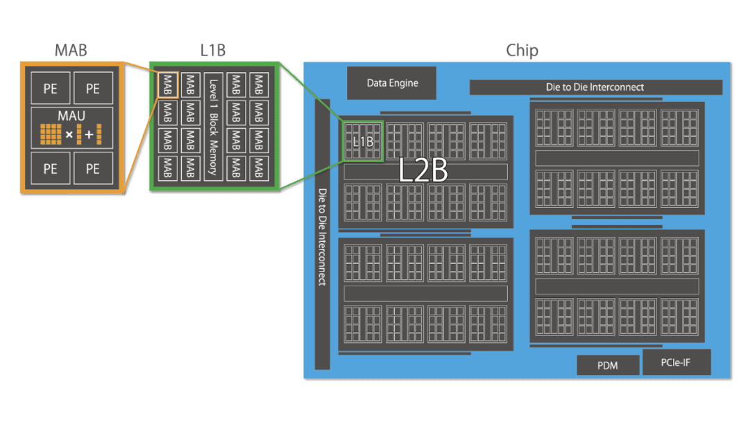 MN-Core第1世代は4ダイ1パッケージで構成されており、ダイにつき512個、計2048個の行列演算ブロックが集積されています。TSMC 12nmプロセスで製造されたMN-Core第1世代プロセッサーは、同一プロセスを採用する他のアクセラレーターに対して非常に高いピーク性能及び、電力当たり性能を実現します。