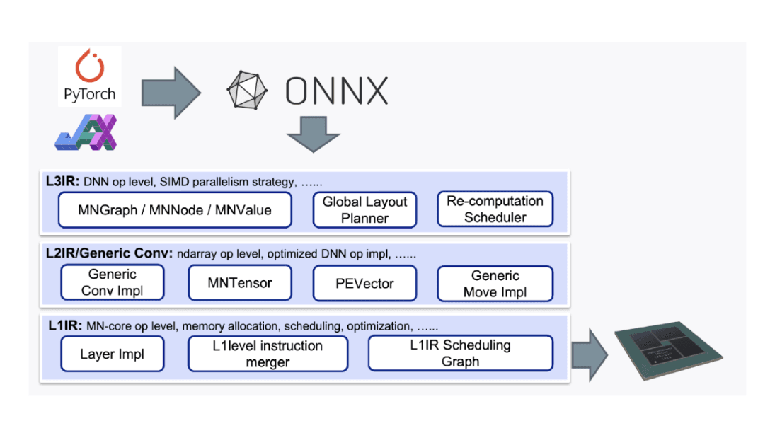 既存のAIワークロードにに大きな改変を加えることなく、スリムかつパワフルに設計されたMN-Coreシリーズプロセッサーの性能を引き出すために、PFNではMN-Coreシリーズ向けコンパイラを独自に開発しています。 MN-Coreシリーズ向けコンパイラはPyTorchやJAXなどの高位言語で定義された計算グラフから最適な命令生成、データ配置、命令供給などを行います。計算グラフレベルの操作から、低レベル命令生成までを最適かつ効率的に行うために、MN-Core向けコンパイラは問題を抽象度に応じて分割し、コンポーネント単位でアルゴリズムの改善が可能な設計を行っています。