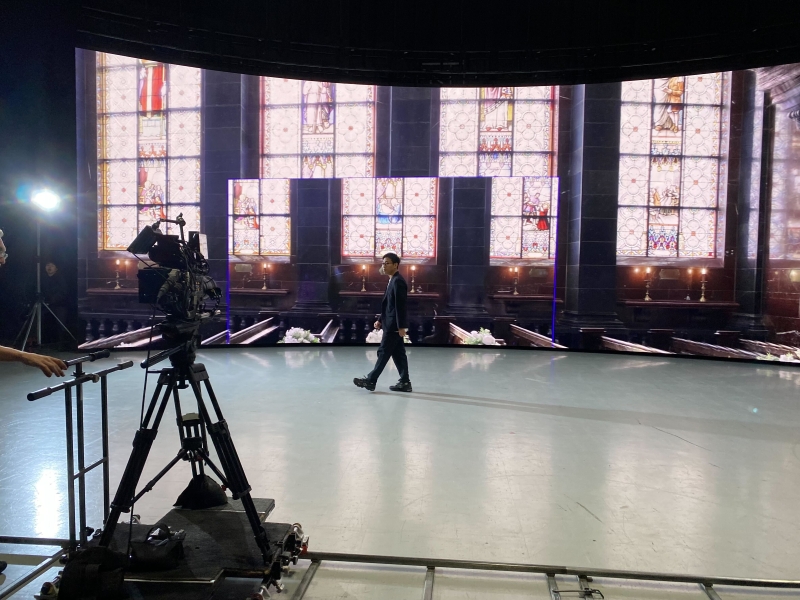 The interactive 3D background is projected on the large LED screen and mixed with a real-life person in front of it in real time