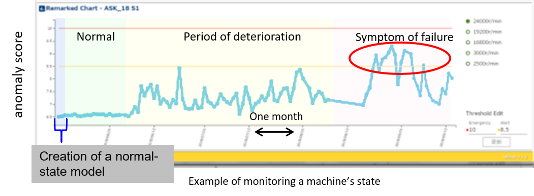 FANUC and PFN have developed a new AI function called AI Servo Monitor which collects control data of feed axes and spindle axes of machines with high-speed sampling. It applies deep learning to the collected data and shows the anomaly score based on the current state of the machine components.