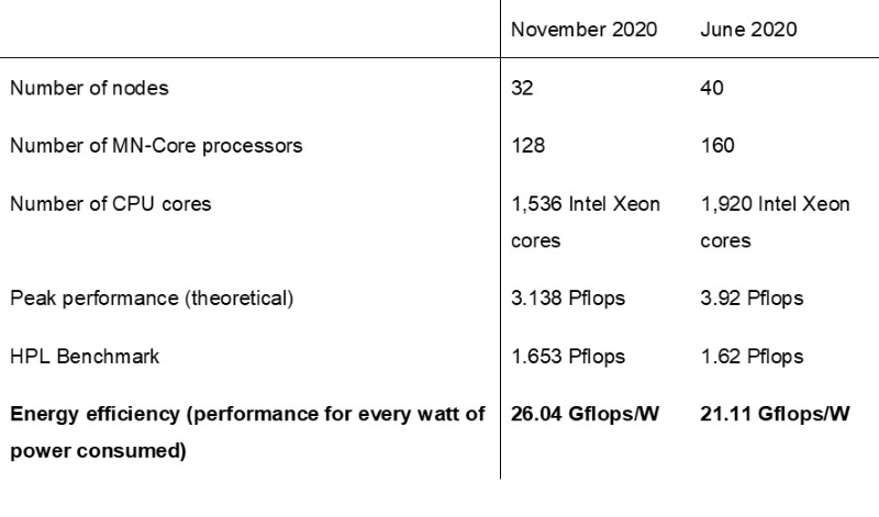 Note: The TOP500 entry states that MN-3 has 1,664 cores. This number consists of 128 MN-Core processors, counted as one core each, and 1,536 Intel Xeon processors. MN-Core performs most of the computations for the HPL benchmark measurement.