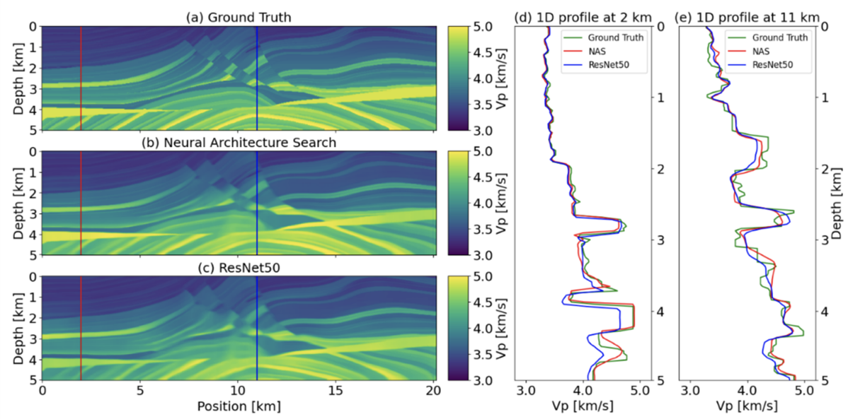 In this experiment, MPE attempted to use a ResNet50-based deep learning model to predict P-wave velocity values from the simulated seismic waveform data from the Marmousi benchmark for subsurface analysis. The neural architecture was optimized using the Optuna framework, which resulted in successful prediction of the P-wave velocity values (Figs b-e).