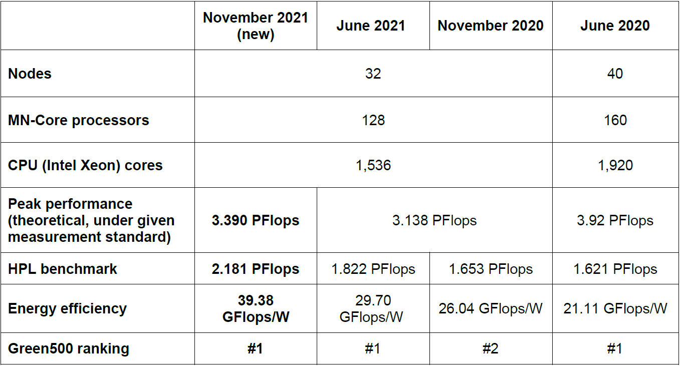 Note: The TOP500 entry states that MN-3 has 1,664 cores. This number consists of 128 MN-Core processors, counted as one core each, and 1,536 Intel Xeon processors. MN-Core performs most of the computations for the HPL benchmark measurement.