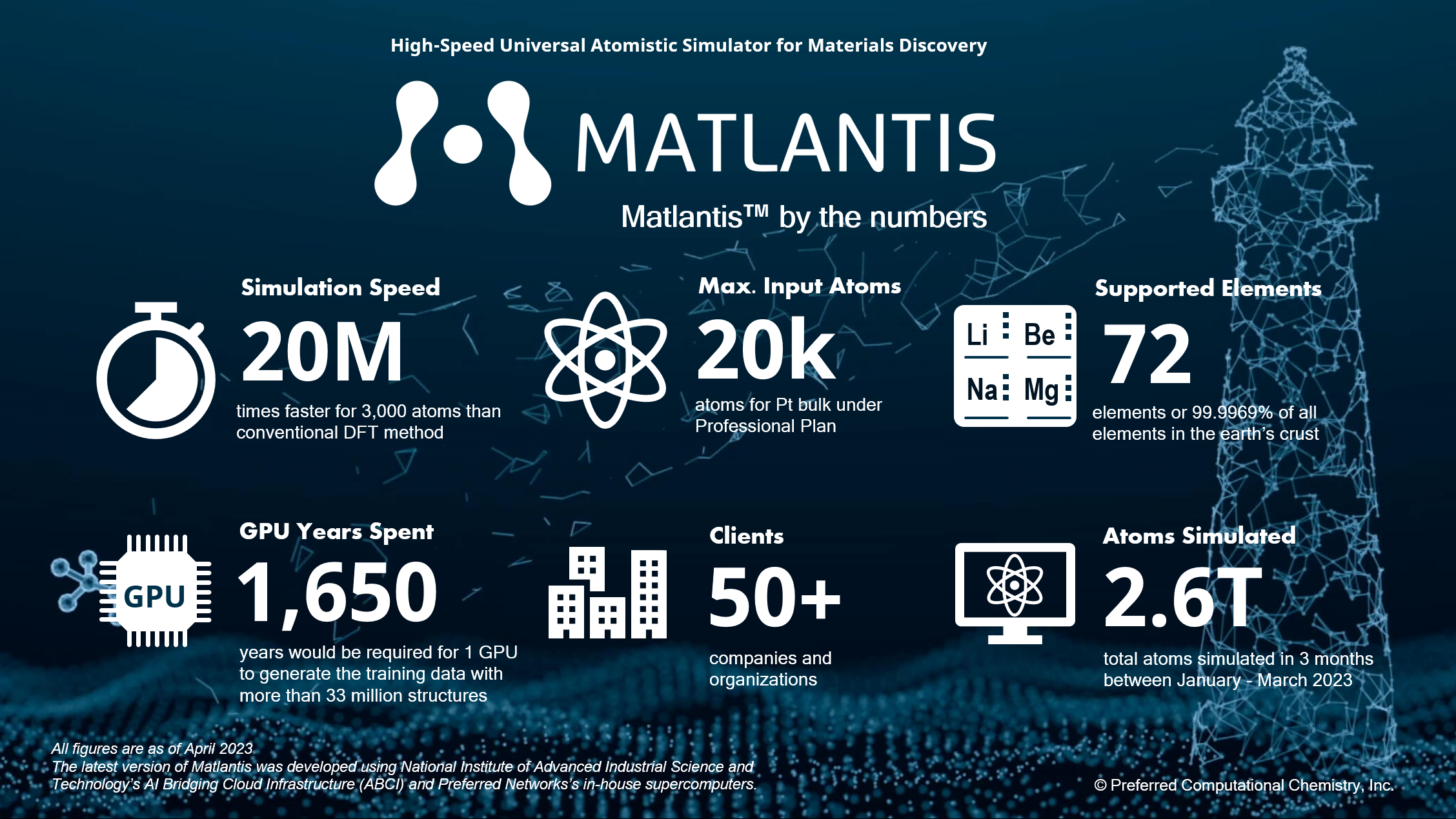 TOKYO – April 28, 2023 – Preferred Computational Chemistry (PFCC), a joint venture between Preferred Networks, Inc. and ENEOS Corporation, has launched Matlantis™, a cloud-based, high-speed universal atomistic simulator for artificial intelligence (AI)-driven materials discovery, for companies and organizations in the United States.