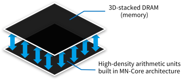 The MN-Core Series’ architecture is characterized by arithmetic units densely mounted on the chip and distributed memory, both controlled by the software to minimize power consumption and exhaust heat. The architecture demonstrated its energy efficiency when MN-3, PFN’s supercomputer powered by the first-generation MN-Core, topped the Green500 list three times in 2020 and 2021. The architecture’s energy efficiency also alleviates the heat due to the 3D-stacked memory, which is a technical challenge the technology is facing.