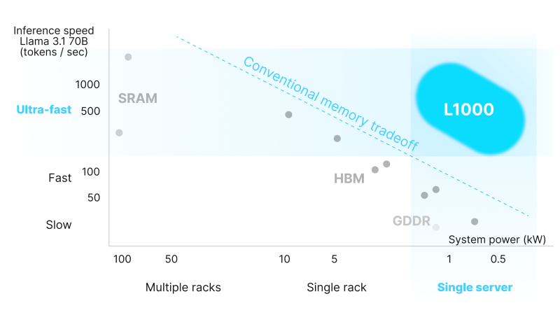 L1000 features a 3D stacked architecture in which its memory is layered on top of the logic, resulting in a wider memory band than high bandwidth memory (HBM) which is commonly equipped in high-end GPUs. L1000 also uses DRAM, a more high-volume and affordable option than SRAM (static random access memory) which is increasingly adopted for use in AI processors.