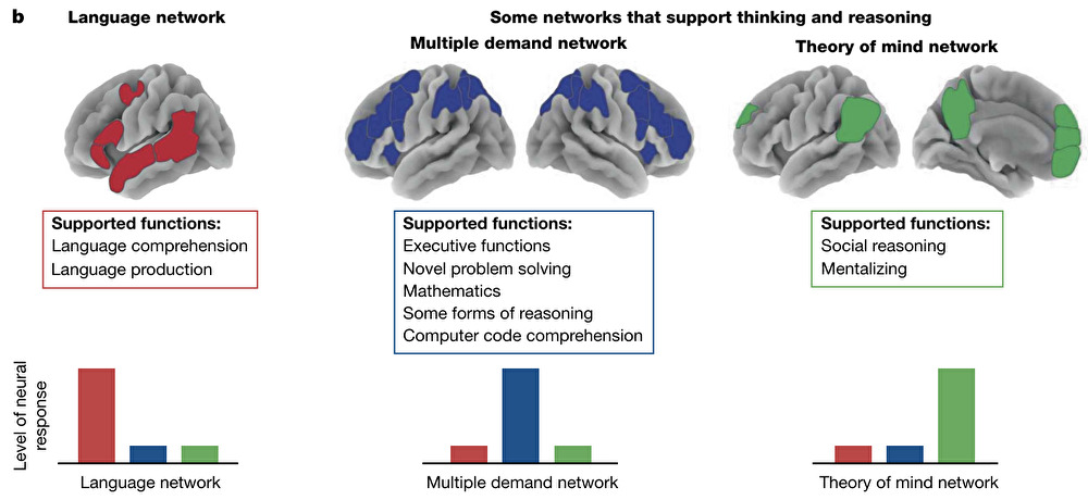 一方で、別のタスク、例えば数学を解いたりだとか、何かの推論を解いたりだとか、あとはプログラムのコードを理解する場合に使われている領域っていうのがどこかっていうのもはっきりわかっている。これは「Multiple demand network」と呼ばれています。あとは「Theory of mind network」って呼ばれる心を読むとか理解するとか、そういった時に活動する領域もわかっています。