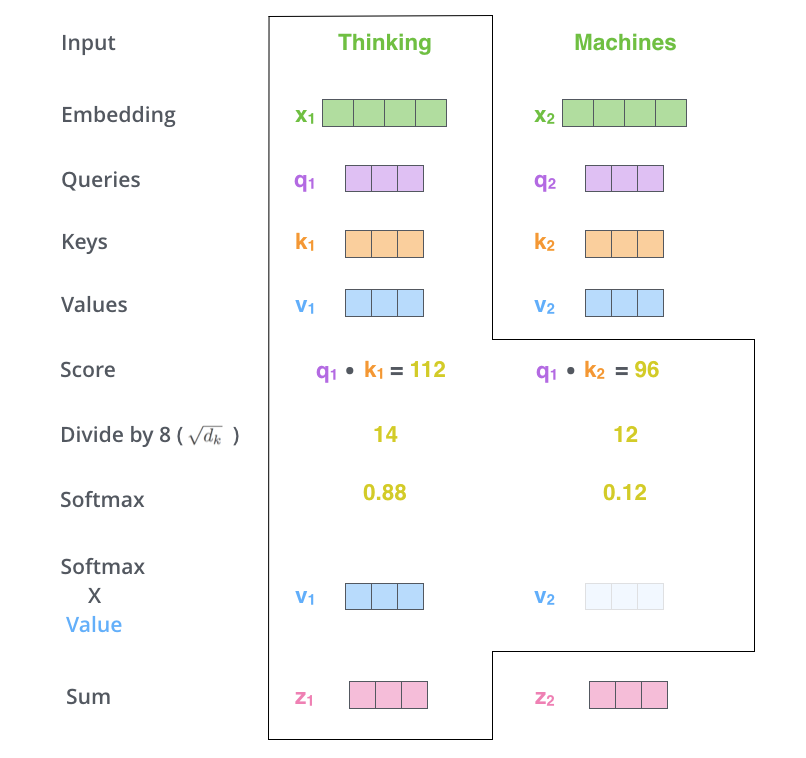 そして「Thinking」っていうトークンに対して、「Embedding(埋め込み)」とよばれるベクトルを計算して、それを元に「Queries(クエリ)」と「Keys(キー)」と「Values(値)」っていう3つのベクトルを出します。ベクトルというのは値をいくつか並べた塊とおもってください。