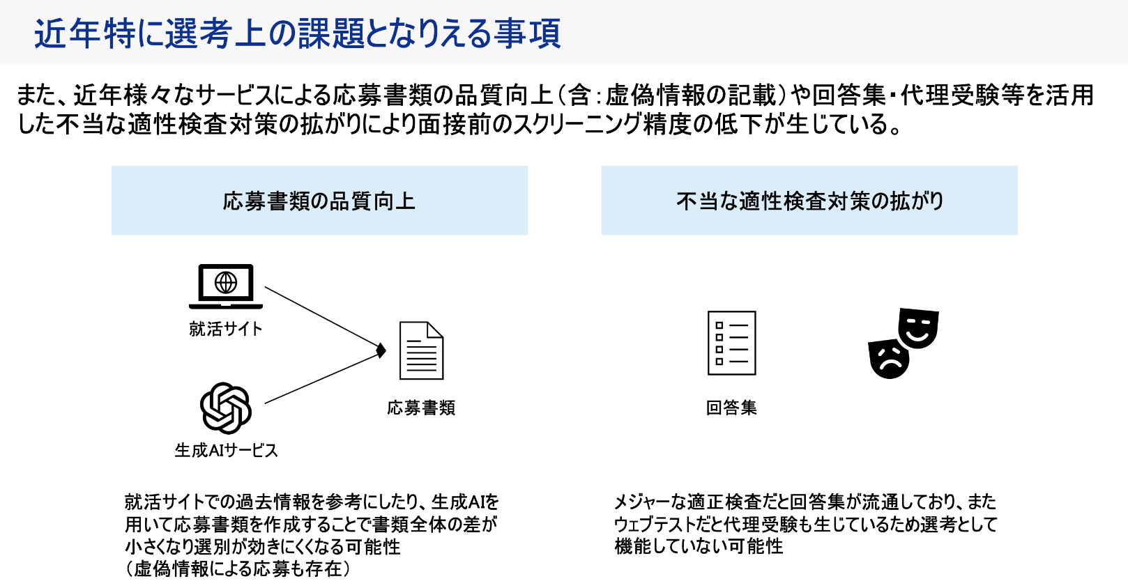 一つ目が応募書類の品質向上です。最近、就活サイトでどういうエントリーシートを出したら受かったみたいなものが出回っていたりします。また、評価が高い文章を参考にして応募書類を作成したり、あるいは生成AIを用いて応募書類自体を作ってしまうというようなサービスも出てきている中で、書類全体の品質の差が小さくなって、選別が出来にくくなっているというところも一つの問題と考えています。