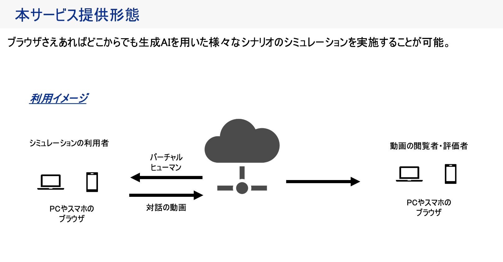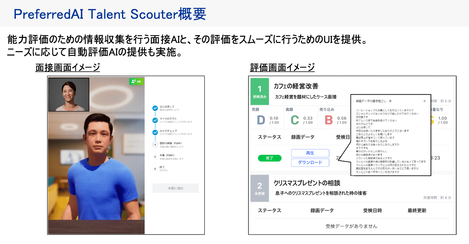こういった動画だったり書き起こした文字を見て、人が評価をつけるという使い方もできますし、ニーズに応じて各社の評価基準を取り込んだ自動評価AIというものの提供も実施します。