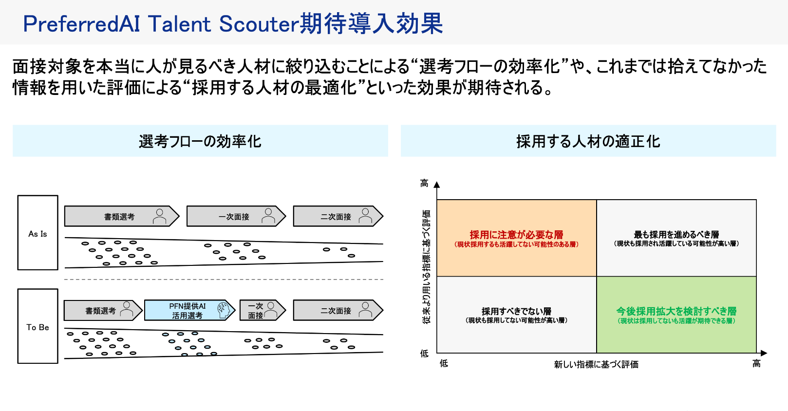 また、従来の書類だけでは分かる要素も少なく絞り込めないというところで、一次面接の必要な件数が多くなってしまうということもあったかと思うんですが、AIで行った面接で、ある程度の人となりやスキルという部分が分かることによって、より絞り込んで、良いコンディションのファネルで一次面接に入ることができるというところで、選考フローの効率化が期待できるんじゃないかと思っています。
