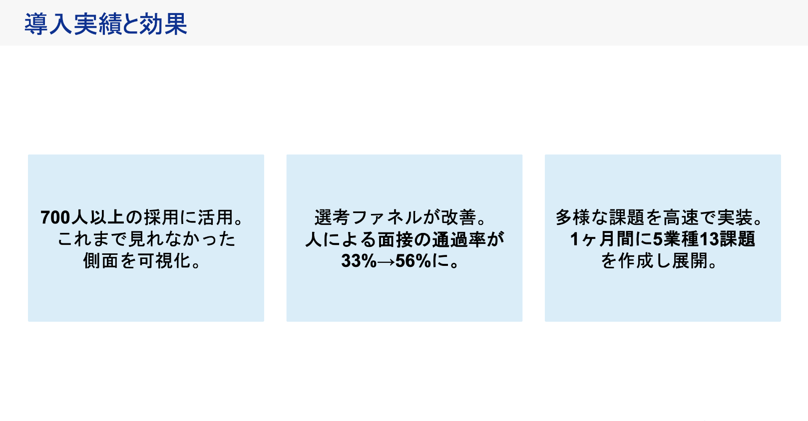 また実際に選考ファネルが改善して、人による面接の通過率が33%から56%に改善したとか、1ヶ月間で5業種13課題を作成して展開するということもできております。