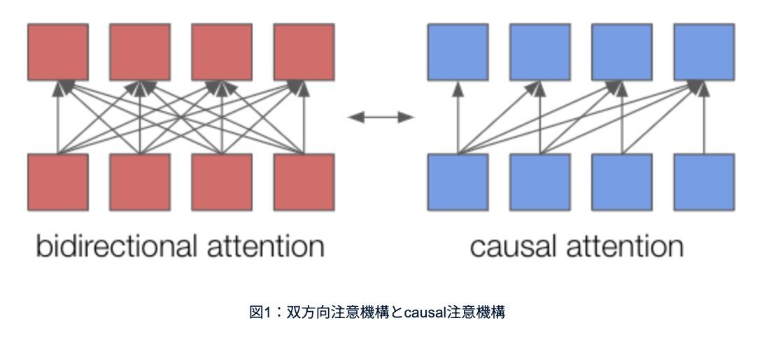 双方向注意機構(bidirection attention)とcausal注意機構(causal attention)というのですが、(細かいところの説明を省くんですけど)ChatGPTみたいな文章を書いていくモデルは順番にトークンを書いていくわけなので、過去に出力したトークンは次のトークンのための計算への入力として反映されるんですけど、逆に未来から過去に向かってのパスは存在しないんですよね。