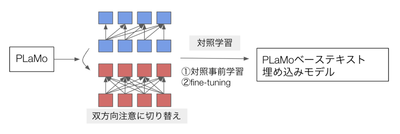 まずざっくり手法を話すと、まずPLaMoの1Bモデルを双方向注意に変換して、対照事前学習した後にファインチューニングするという学習方法を取りました。これは結構細かい話なので詳細を省くんですけど、こういうテキスト埋め込みモデルを作るときの典型的な学習方法の一つです。