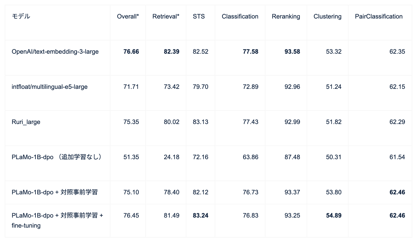 全部のベンチマークに含まれているデータセットの平均値で、「OpenAI/text-embedding-3-large」というのが一応一番強いモデルなんですけど、その76.66というスコアに対して76.45っていうかなり近い、もうちょい上手くいったら勝てるんじゃないかくらいのスコアが達成できています。