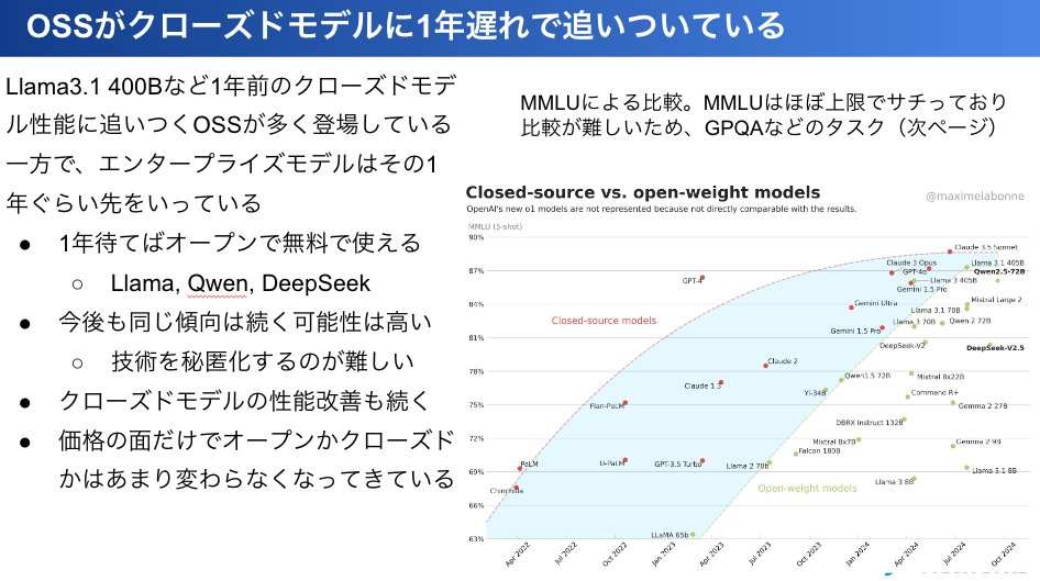 これまでの数年間は、基本的にはクローズドモデルが最初にベンチマークなどで先行しますが、オープンモデルの方が必ず追いつく構図が続いています。