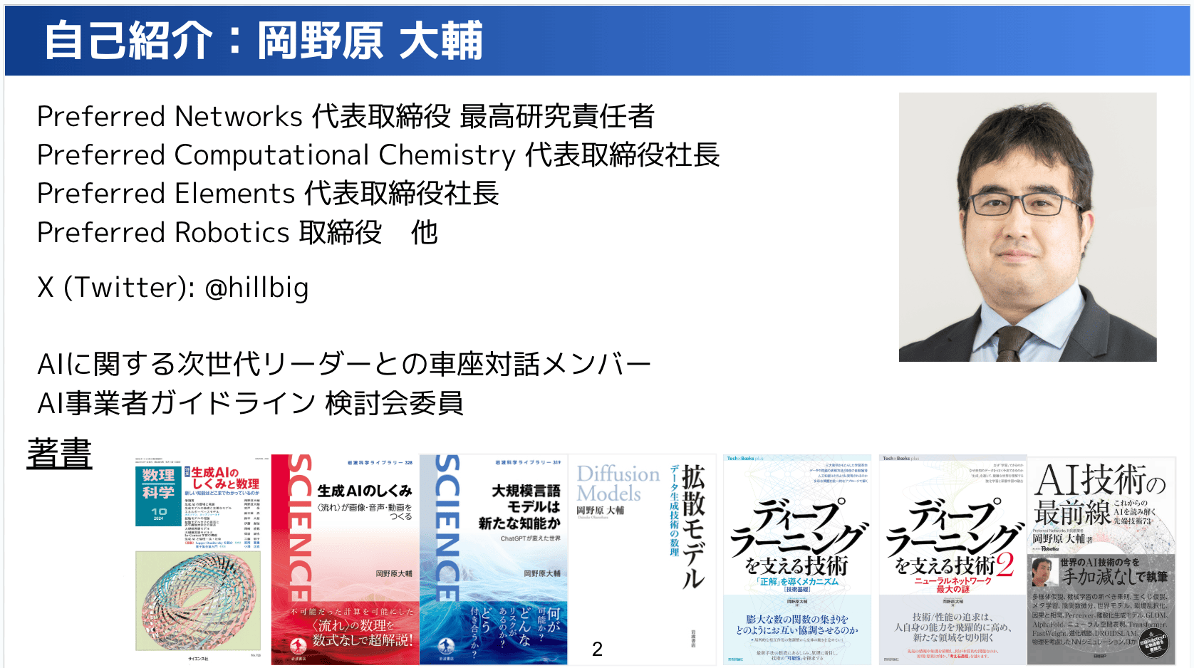 この左から2番目の赤い本がちょうど先日発刊されました。この話の中では今回のノーベル賞を取ったホップフィールド先生とヒントン先生、あとはAlphaFold側のディープマインドのデミス・ハサビスさんとジャンパーさんの話をカバーしています。この本を読めば、全ての内容がカバーされているというものです。