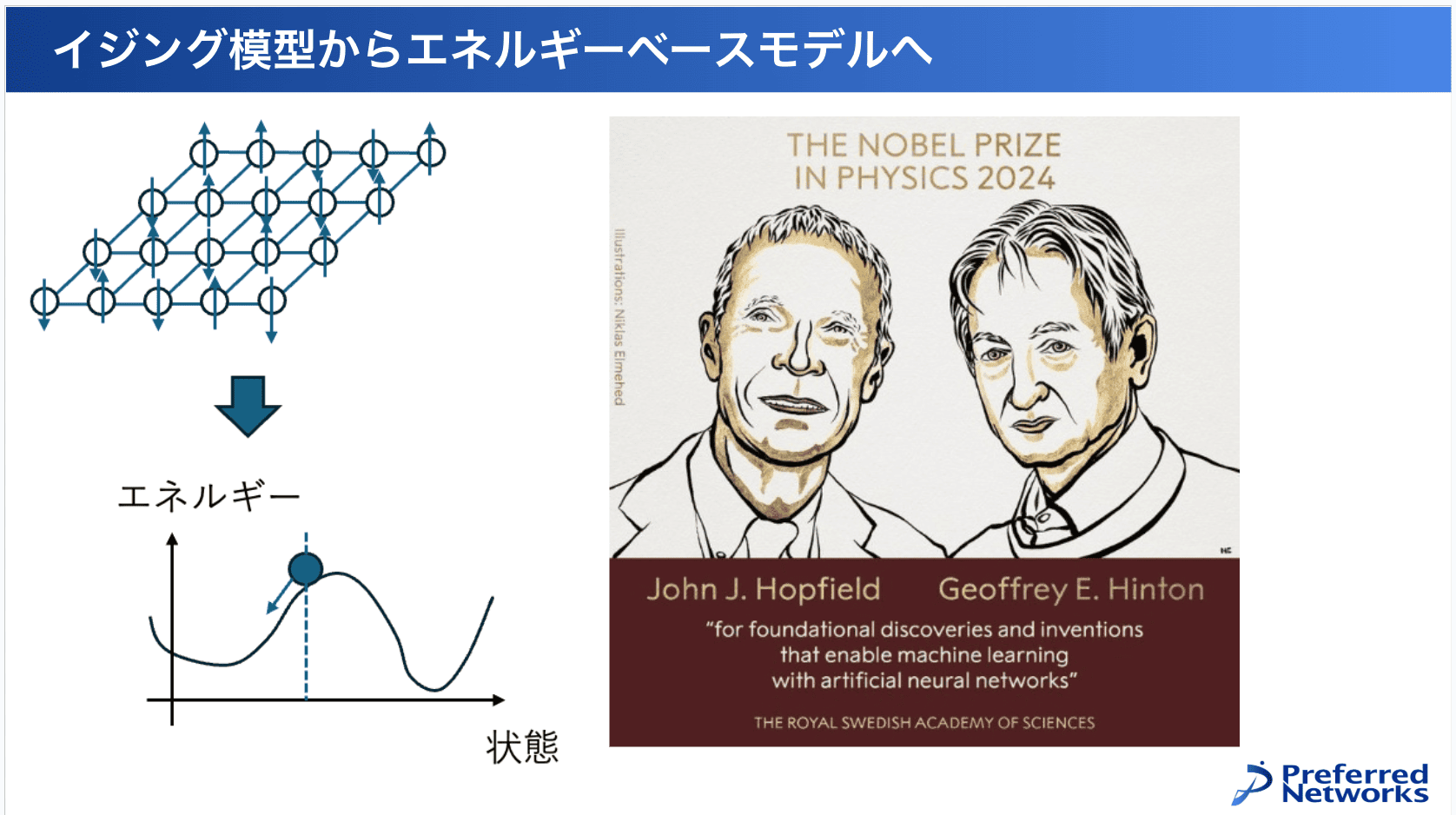 ホップフィールド先生がこの論文を出したのが1980年くらいなんですが、1973年に日本の中野馨先生、1974年に甘利先生が同様の提案をしていました。なので、ホップフィールド先生がこのアイデアを最初に出したわけではないですが、それはみんな知っている話です。