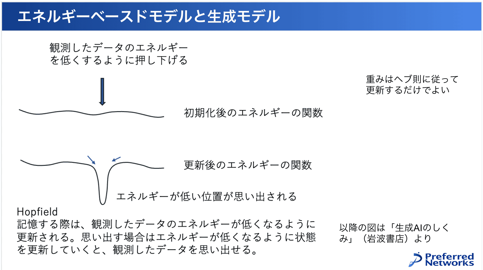 ホップフィールドモデルがそのまま使われているわけじゃないんですけども、これが発展していって、例えば今の画像生成や動画生成などで使われる拡散モデルとフローベースモデルにつながっています。