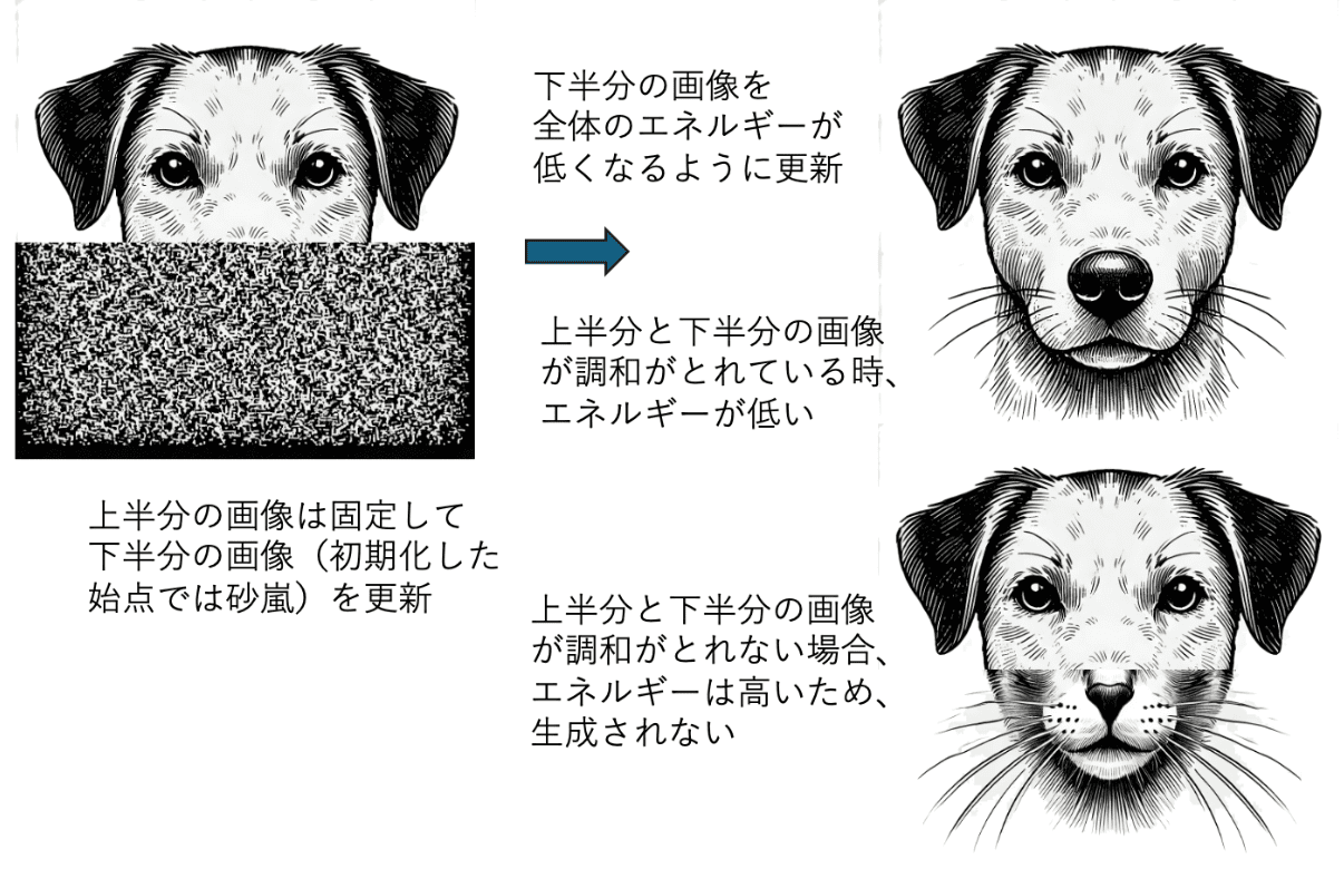 例えば上のような画像(書籍から引用)があって、上半分は犬の画像にして、下半分はランダムに初期化したような砂嵐のようなものを作ります。これは、上半分は犬なのでエネルギーが低いけれども、下半分は別の動物で、上と下が調和が取れていないからエネルギーが高い状態にあるわけです。