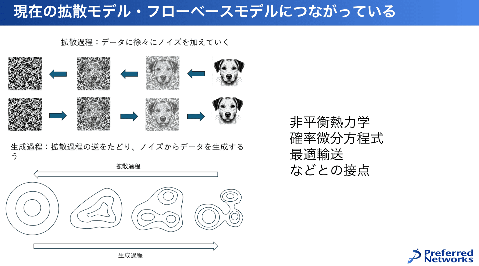 あとは学習するときも、エネルギーベースモデルは綺麗な理論ですが、学習効率が悪かった。でも今の拡散モデルとかフローベースモデルはそれを効率的に学習できるような工夫が入っています。