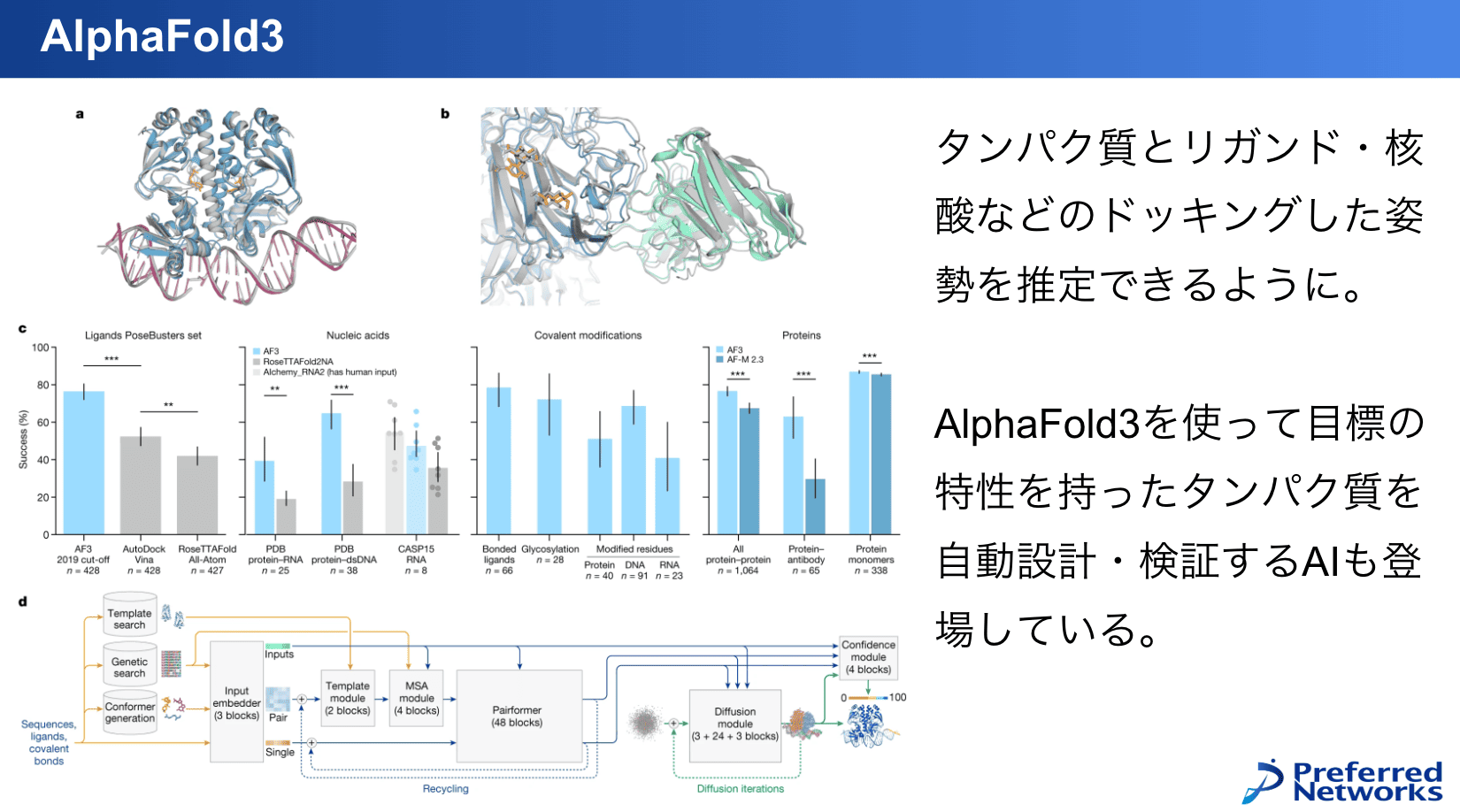 もう一つ、ノーベル化学賞を取った「AlphaFold」についても説明します。最新のAlphaFold3は拡散モデルベースで、構造が与えられたらその姿勢を生成するようになっています。