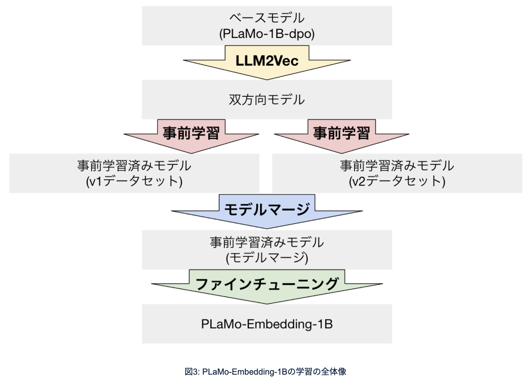 どういう風に学習したかというと、面倒なんですが、LLM2Vec、事前学習、モデルマージ、ファインチューニングという4段階をやっています。