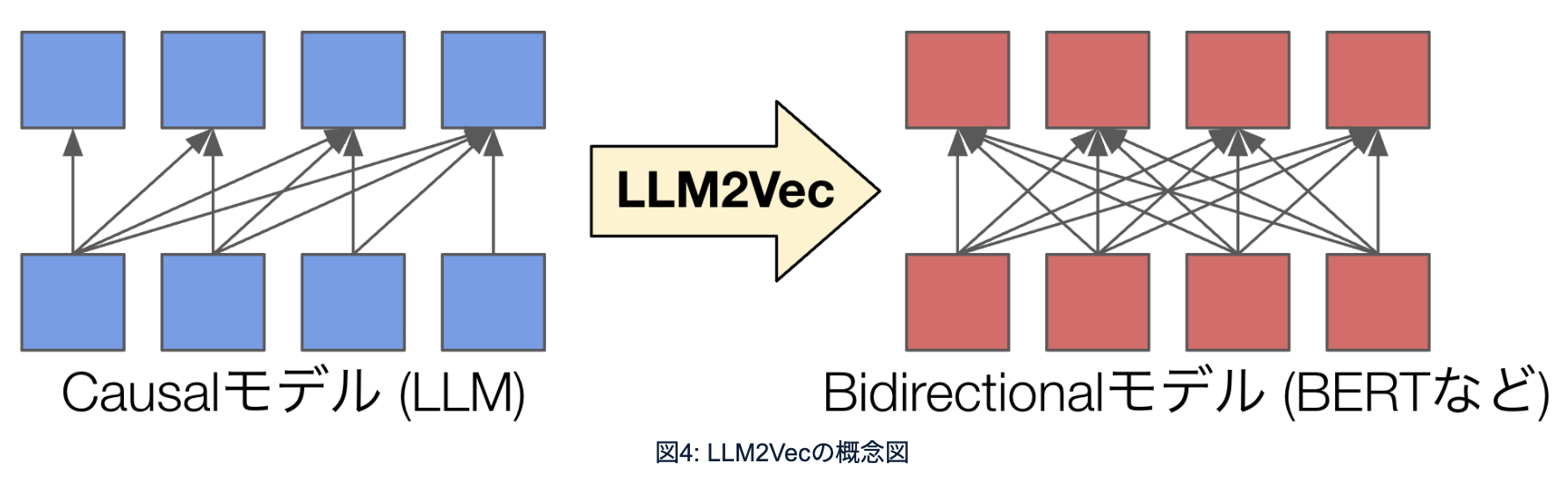 最初にLLM2Vecなんですが、LLMみたいな言語モデルはTransformerによって実装されているんですが、ある文章、ある瞬間の単語、トークンを生成するときに、その時点より過去のトークンしか見ません。