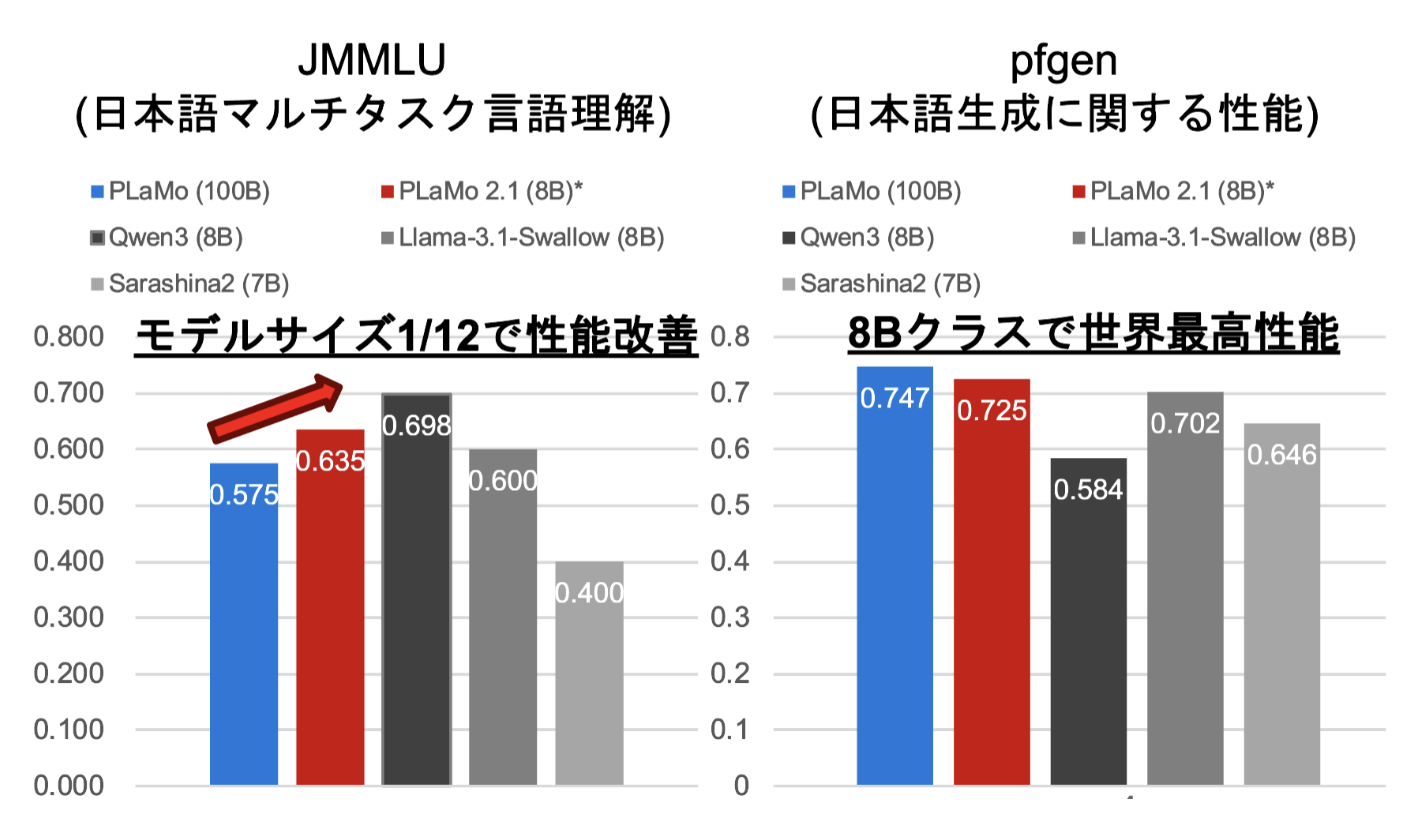 例えばpfgenと呼ばれる日本語や日本の様々な知識を問うようなところに関しても、同じモデルサイズの中では1番高い性能を達成することができています(右図)。