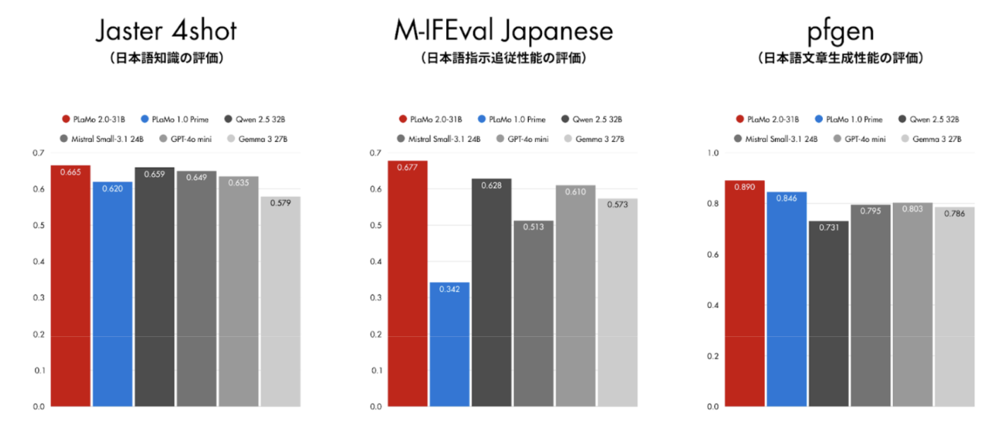 特にですね、M-IFEval Japanese(日本語での指示追従性能)が前のPLaMo 1.0 Primeだと低くて、これが結果として、ユーザーが使っていて「指示を出してもちゃんと言うことを聞いてくれない」ということで使うにあたって問題があったんですけども、ここに関して、すべて解決とは言えないですがかなり改善をしていると思います。例えばQwenやMistral、 Gemmaの同サイズのモデルよりも高い性能を達成しています。