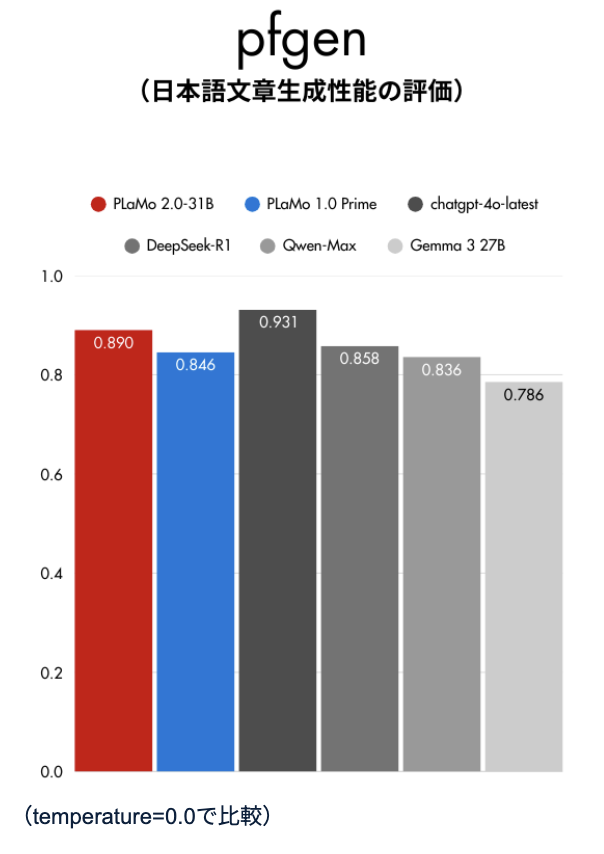 同じモデルサイズでの比較ではなくモデルサイズ無制限級のところで比較すると、さすがに1番進んでいて、おそらくモデルサイズも圧倒的に大きいようなモデルであるChatGPT-4oにはpfgenで負けてしまうんですが、DeepSeek-R1(モデルサイズは685B) だとかQwen-Max(おそらく>200B)とか、そういったものに対してはそれよりも高い性能を達成することができています。