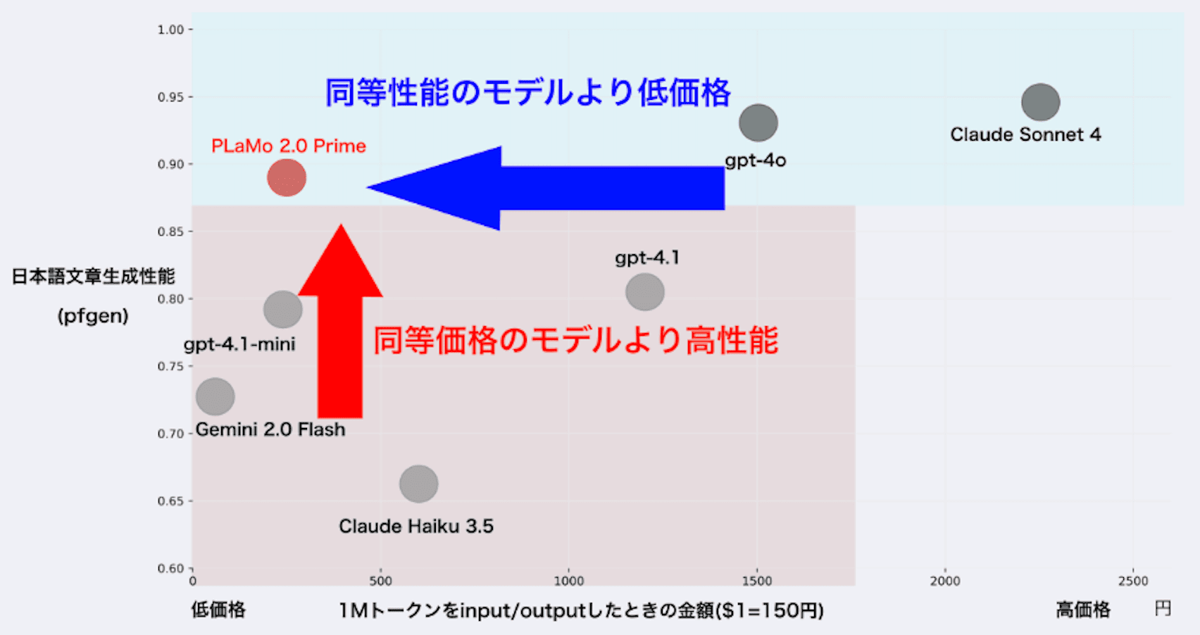 こういった高い性能を達成しながらも、逆に提供価格を抑えることができていて、従来のPLaMo 1.0 Primeと比べて約1/4、正確には出力が1/4、入力が1/5の価格設定をしています。