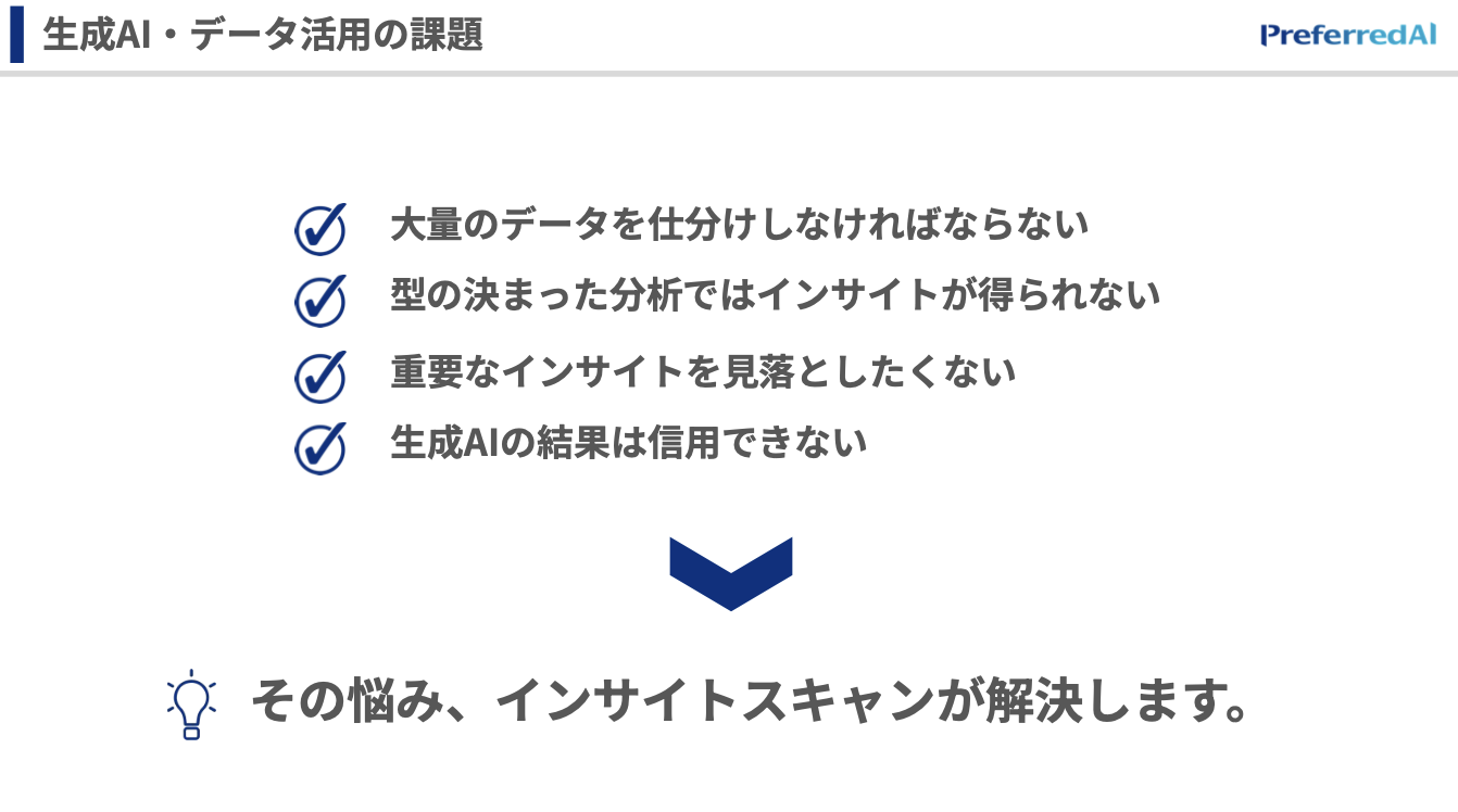 そこで、生成AIを使って良い分析をしましょうというのが、このインサイトスキャンのやりたいことです。
