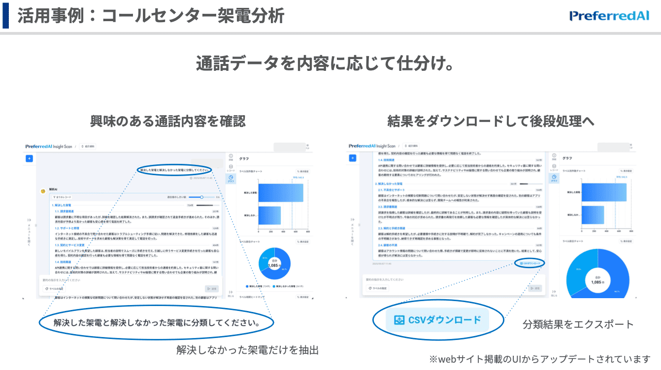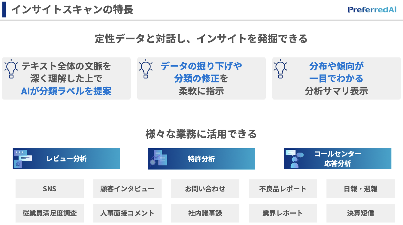 テキスト分析というと、昔から古典的な自然言語処理が行われてきたと思うんですけれども、最近の生成AIだと、より人間的な読み方ができるというのが特長で、インサイトスキャンはまさにその特長を十分に活かしたツールになっています。