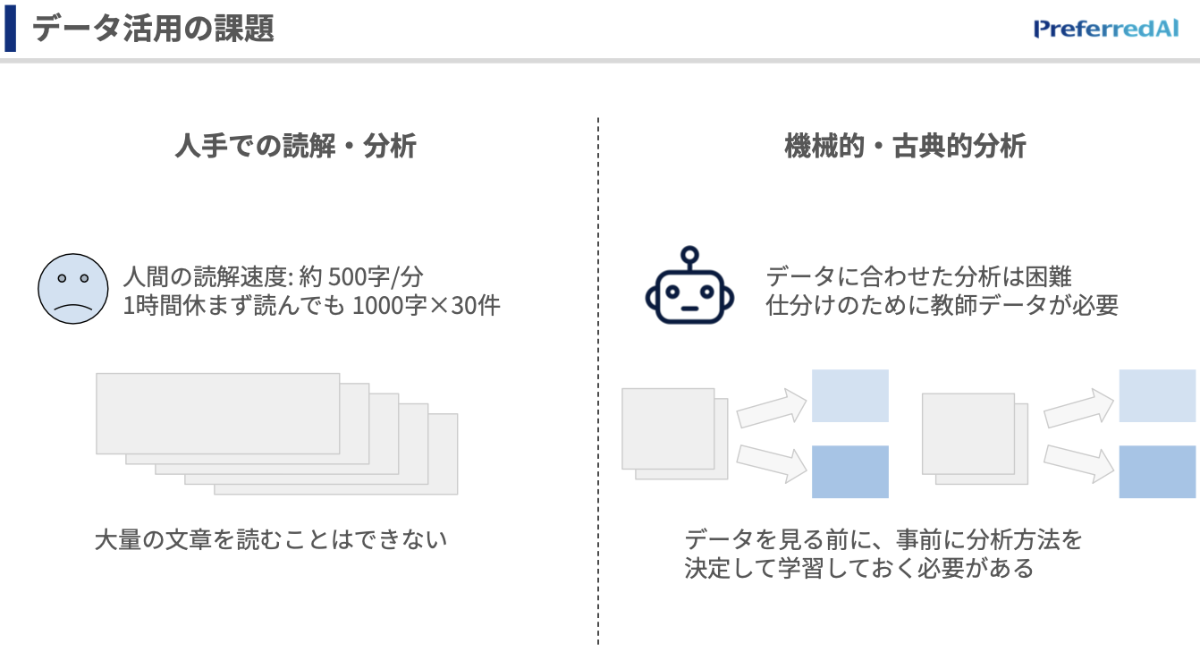 一方で古典的な分析ですと、分析の内容を事前に決めなければならなかったりします。つまり、例えばセンチメント分析(ポジティブやネガティブに分けるなど)ができたとしても、そのポジティブの中で何に言及してるんだろうっていうのを1つ1つ見ていくみたいなことは、結局最後は人が目で見なきゃいけなかった、というのがこれまでの分析かと思います。