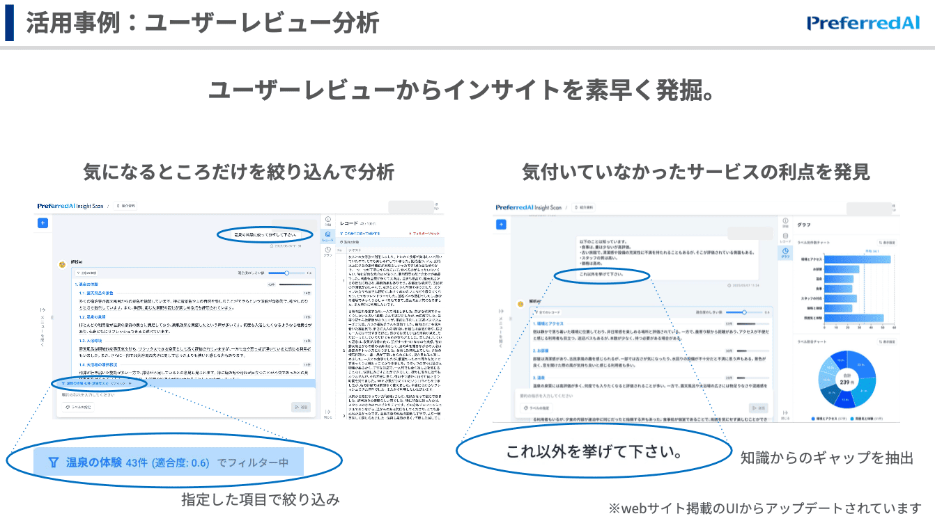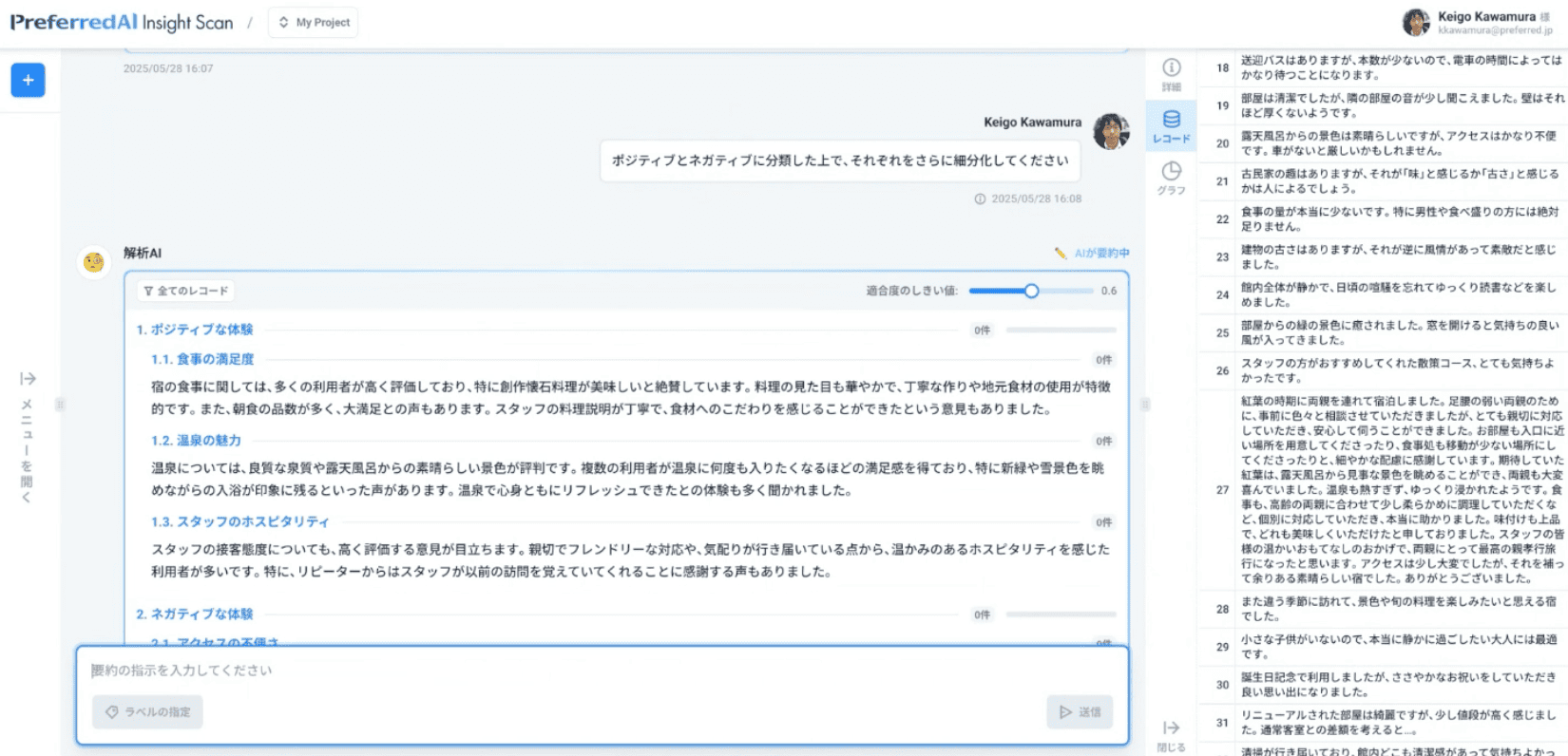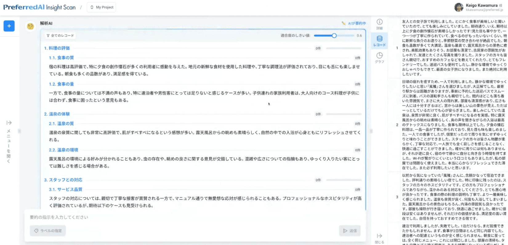 こちらの画面は、インサイトスキャンの実際のアプリケーションです。例えば、こちらに先ほどお見せした温泉宿のレビューデータを入れてみたいと思います。