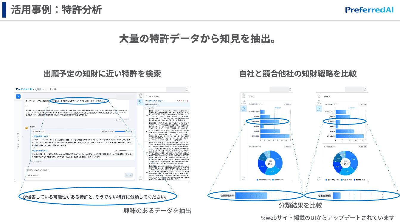 実際、この特許分析はNTT西日本さんに既にご活用いただいておりまして、元々人が1つ1つ特許を見て、「自分たちがどういうところで強みを持っているのか」というのを分析していらっしゃったと伺っているんですけれども、それを3時間程度で数1000件単位で分析が行えるということで、大規模のデータを高速に分析できるというところに強く共感をいただい ています。