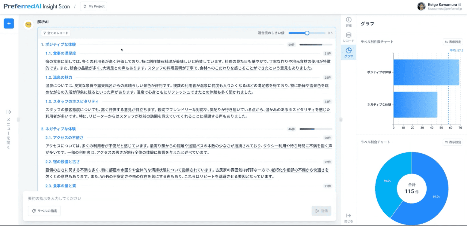 ただのチャットではなくて、テキストデータ全体の文脈を深く理解した上で、「分類ラベル」というものが提案され、その分類に応じて「データの掘り下げ」とか「分類の修正」を指示して、分布や傾向を見ることができるツールになっています。
