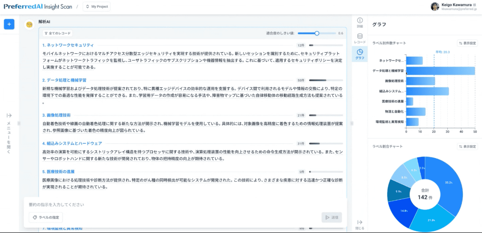 「分類ラベルを提案してそこに分類する」という基本的な機能の中で、例えばデータの掘り下げや、分類の修正、結果の一覧表示であったり、あるいは非常に長い文章であっても全体を高速に分析ができます。