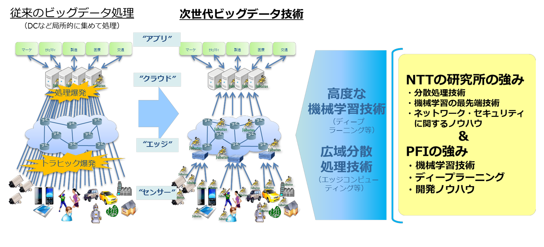 これまでNTTの研究所とPFIは、2011年よりビッグデータ処理基盤「Jubatus」の共同開発を推進してきました。Jubatusとは、Hadoop等の既存ビッグデータ処理技術に比べて、リアルタイム性と深い分析とを併せ持つ世界初のリアルタイムビッグデータ処理基盤技術であり、ビッグデータ活用に寄与する共通財産として、オープンソースソフトウェアとして公開しています。