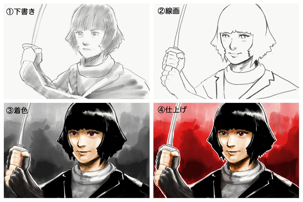 ■下記①~④のお絵描き工程のうち、③着色工程に自動着色機能を使うことができます