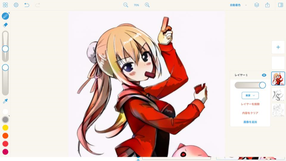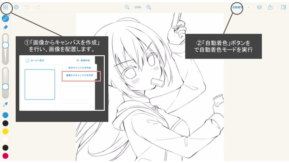 これはイラスト制作のうちの「着色」という重要な工程を手助けしてくれるもので、pixivSketch上で描いた絵や外部画像ファイルを選択して自動着色ボタンをクリックするだけで、AIがイラスト上の顔や服装、風景等を認識し、自動的に色が塗られます。また色の調整も可能で、カラーパレットから線画上の任意の箇所に、好きな色をヒントとして指定して自動着色することもできます。