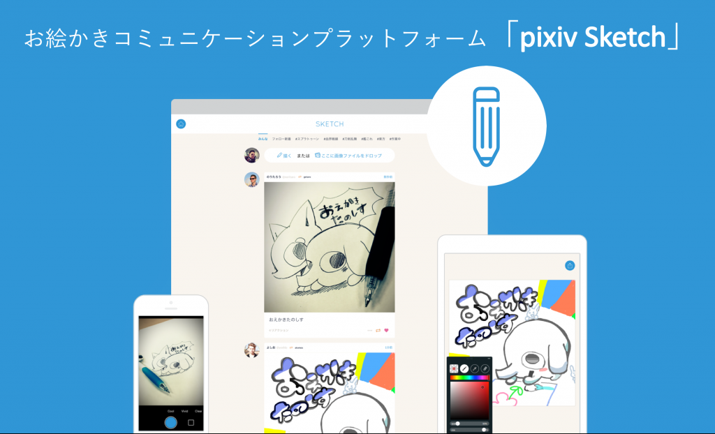 pixiv Sketchは、PCやスマートフォン等のデバイスを通じてお絵描きしたものをそのまま投稿できるコミュニケーションプラットフォームです。部屋の中でくつろいでいる時も、友達と外で遊んでいる時も、いつでもどこでも気軽にお絵描きをして、お絵描きを投稿することでコミュニケーションをリアルタイムに体験できます。