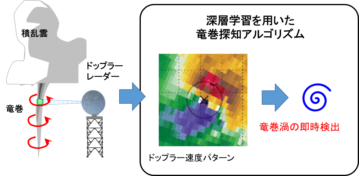 日本では近年、竜巻発生確認数が毎年20件を超えており、竜巻を素早く的確にとらえ危険を回避するための気象予測情報は、自然災害リスクを減らすために非常に重要です。特に、夏季の竜巻は活発な対流をおこす積乱雲にともなって発生するため、周囲に見られる複雑な風向きの多様なパターンから、ごく小さなエリアで局地的に発生する竜巻渦だけを正確に自動検出することはこれまで困難でした。