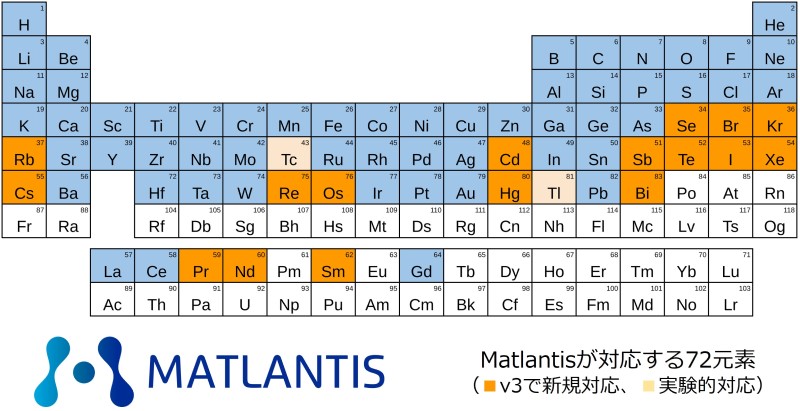 今回のバージョンアップによりMatlantisは、周期表の微量元素を除いた大部分をカバーする72元素に対応しました。これは、地球上に存在する物質の99.99%以上*3にあたります。