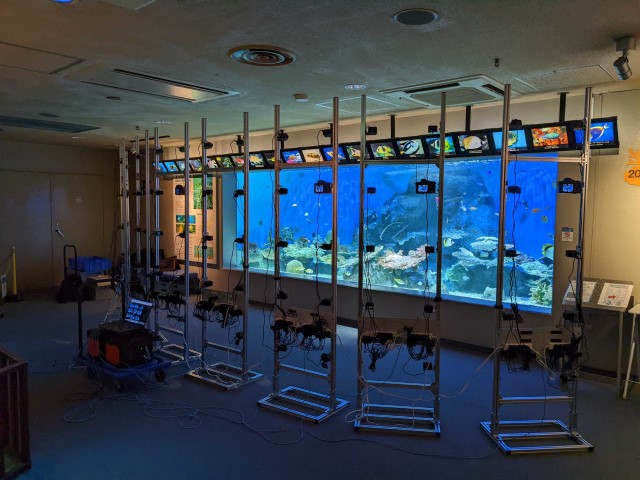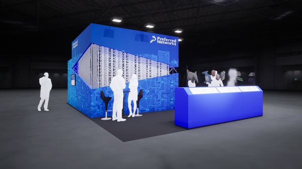 現実の三次元空間でスポーツや演技をする人物、動物など動きのある対象を専用装置で撮影し、自由視点で閲覧可能な3Dアニメーション映像として仮想空間に復元するボリュメトリック・スキャンシステム PFN 4D Scan を初公開します。従来技術のような専用スタジオが不要なため、屋内外を問わずあらゆるシーンのスキャンが可能です。3Dアニメーション映像の復元にはPFNのスーパーコンピュータを使用しており、シーンの立体構造及び時間変化をすべて深層学習モデルで表現するという、従来手法とは全く異なるアプローチを採用しています。PFNブースでは、来場者が3Dメガネを着用し、PFN 4D Scanで復元された3Dアニメーション映像による複数のシーンを自由視点で閲覧することができます。