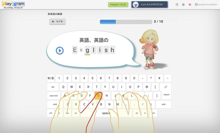 Playgram Typingは、コンピュータを使いこなすための基礎となるタイピング力を育成することを目的に、プログラミング教材Playgramの補助ツールとして、2020年8月にWebアプリが無料公開されました。キーボードのホームポジションを習得し、日本語のローマ字タイピングの正しい指使い、正確性、スピードを身につけられるよう設計されています。先生向けの学習指導要綱も整備されているため小中学校の公教育の授業でも活用されており、いまでは全国で月間100万人超のユニークユーザーにご利用いただいています。